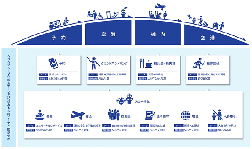 ANAグループではESGにおける重要課題として、2015年度に「環境」「ダイバーシティ・エクイティ・インクルージョン(DEI)」「地域創生」を特定した後、2016年度に「人権」を追加しました。これら4つの重要課題における中期的な達成目標を設定し、その具体的な取り組みを実施しています。